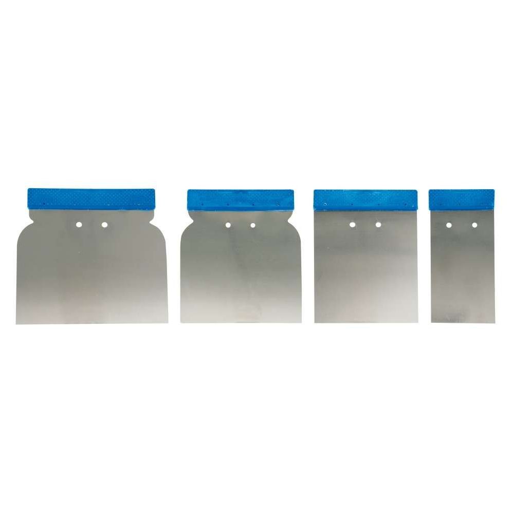 Lățime de lucru: 50, 80, 100, 120 mm Material: oțel inoxidabil Tratament de suprafață: lustruit Material mâner: PVC Număr de piese per set: 4 Aplicație: aplicarea precisă a amestecurilor, nivelarea suprafețelor înainte de vopsire